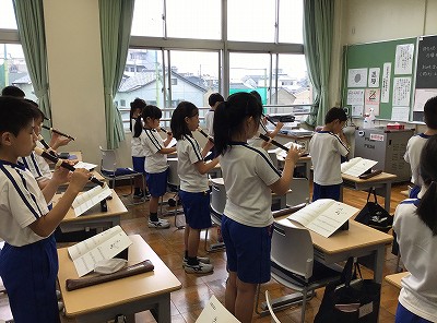 教室では、「ラ」の指使いと音出しの練習に時間を使いました。その最適な曲がテキスト笛星人に載っている「シロロリロン」。少しさみしい感じのメロディが、やさしく奏でようとする気持ちを高めてくれます。