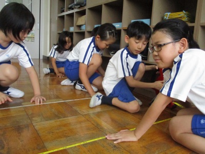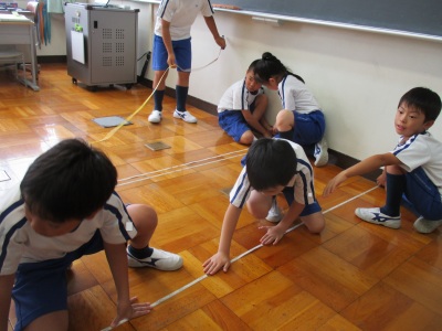 巻き尺を使って、机の長さや教室の前から後ろまでの長さを測りました。