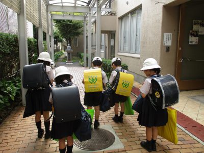 子ども達は荷物を提げて「私たちの勢至丸さま」にご挨拶。