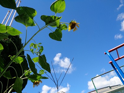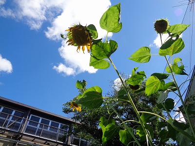 学習園では、ヒマワリが背をいっぱいに伸ばして、畑を見下ろしていました。