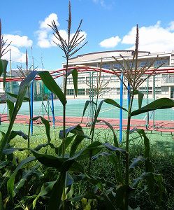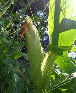 そして、おいしそうなトウモロコシの実です。もう少しで食べごろです。そういえば1学期の給食にコーンご飯を食べましたね。