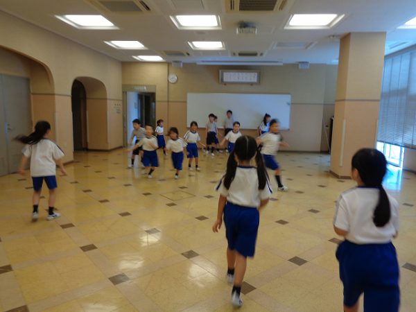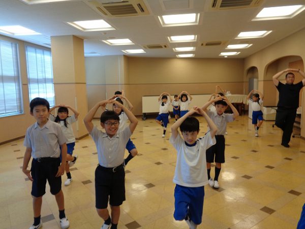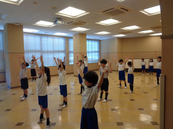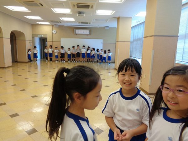 子どもたちが多目的室(和の部屋)に集まってくれるか心配でしたが、英語朝体操の為に早起きしたという子もいるくらいで、たくさん参加してくれました。