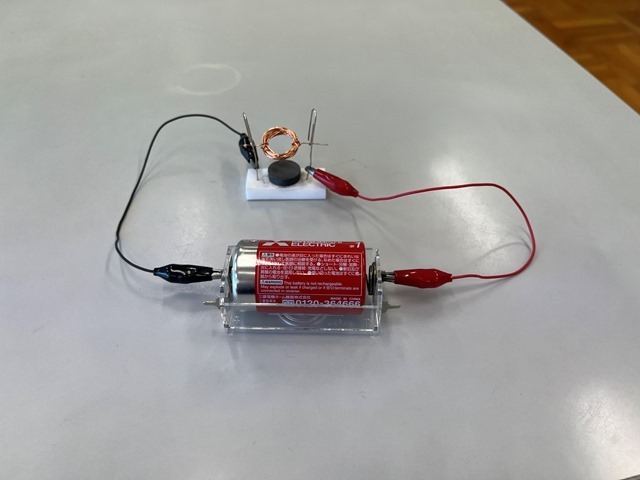 3.電池とクリップをつなぎ、クリップにコイルをセット