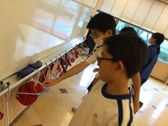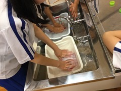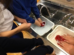 赤白帽を手洗いする“洗濯実習”の時間です。
