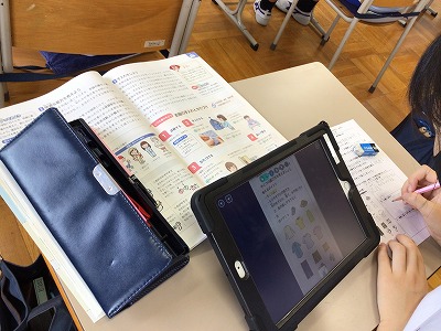 ポイントは、それを選んだ理由を書くこと。色つきの資料が提示されたタブレットも活用して、服装選びに取り組みました。