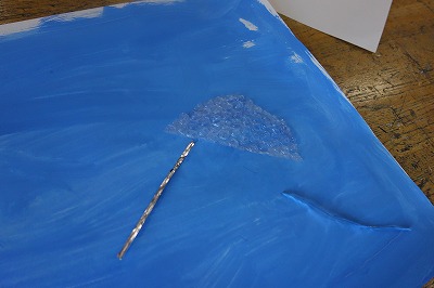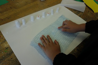 この児童は白い紙,白い緩衝材,そしてプチプチを使って「雪と氷の世界」がひらめきました。