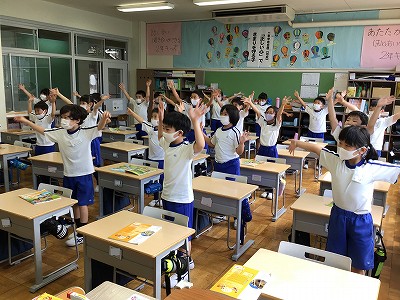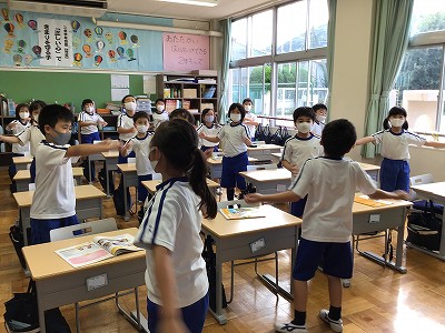特徴的なのは、体操?指揮者?のように、強いストレス(声を上げるところ)の時には、手を一緒に上にあげて、体で音と言葉を覚えていることです。意識してがんばっています。