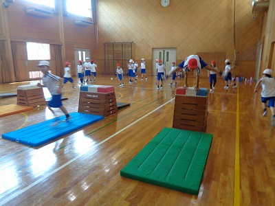 前回の体育で、開脚とびの4段からスタートして、今日が二回目の跳び箱です。今日は、まずペアで準備活動を行いました。全5コースがみんなの協力で短時間でできました。とびばこをとぶ前に、かえるの足うちでウォーミングアップ。