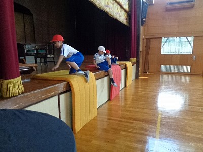 ステージにマットをおいて、手をしっかりついて体を保持し、高い所にのる練習もしました。