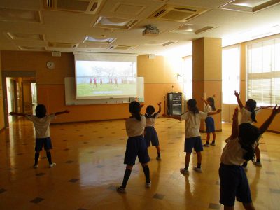 いつもの「英語ラジオ体操」に合わせて、体操しました。