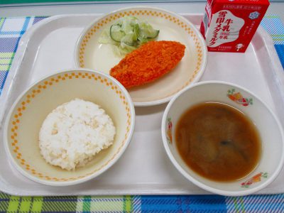 今日の献立は「白身魚のフライ、キャベツのサラダ、なすの味噌汁」でした。