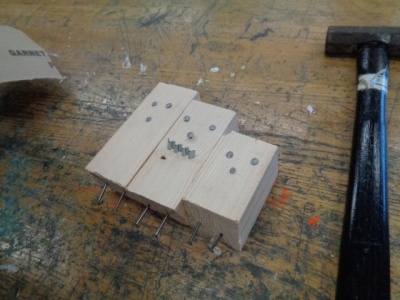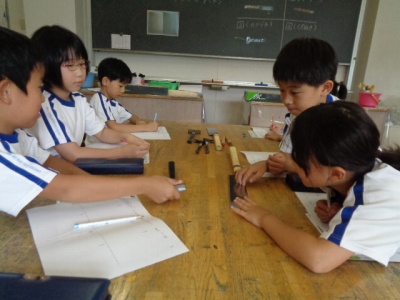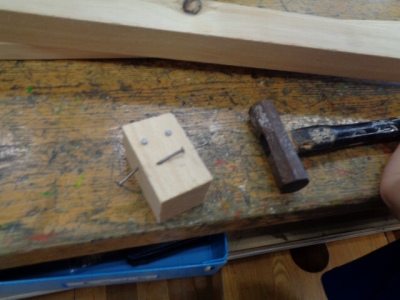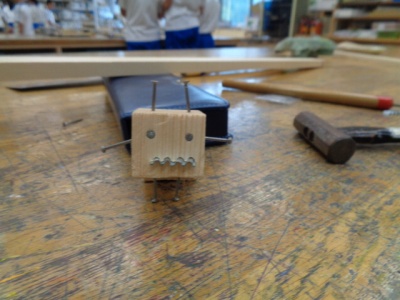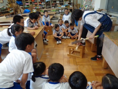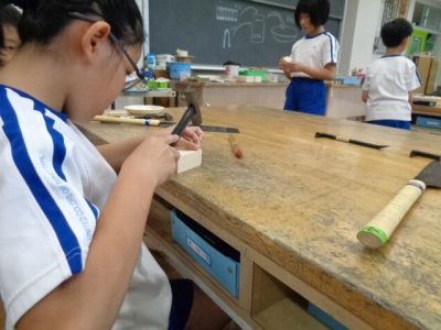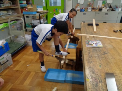 「のこぎり・くぎぬき・かなづち・きり」の4種類を使って、角材にくぎを打ち、作品を作りました。まず、道具の使い方の確認です。