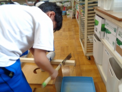そして、安全に気をつけて、のこぎりで角材を切ります。