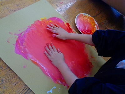 絵の具の量を調整して色を作り、手のひらに絵の具をたっぷりとつけて、自分の顔を塗っていきます。
