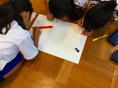 ギャラリーでおしゃべりしている友達や、教室でお絵かきしている仲間に声を掛け、世界の子ども達をテーマにしたスケッチを寄せ書(描)きしてもらおうと考えました。