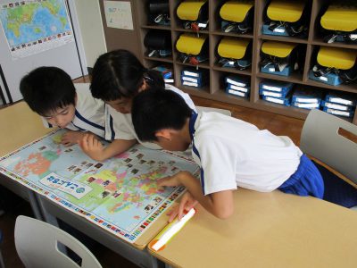 今日は世界地図を使って、たくさんのカタカナを読む学習、言われた国を探すクイズなどをしました。