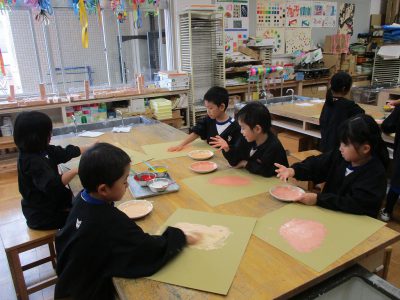 顔の形が仕上がった後は、手形をつけて乾かしました。