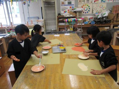 肌の色は、赤・白・黄の3色の絵の具を自分で混ぜて合わせて作ります。
