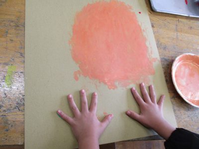 絵の具の量を調整して、「この色!」と決まったら、手のひらに絵の具をたっぷりとつけて、自分の顔を塗っていきます。