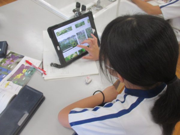 さらに、単性花で「おしべ」のある花を「雄花」、「めしべ」のある花を「雌花」ということを伝えて、花の作りを見て、似ているところと違うところを調べました。