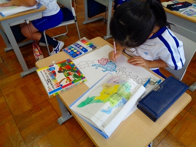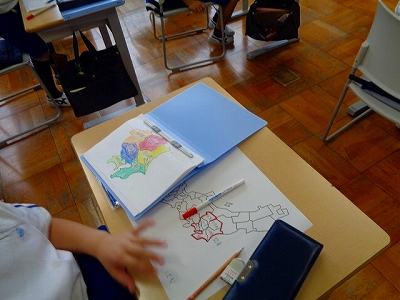 「○○産の野菜」など、お店では産地をよく見かけますが、都道府県の場所をおさえるためです。 関東・中部・近畿・中国・四国地方と地図に色分けをして、確認していきました。