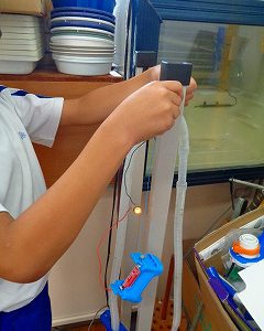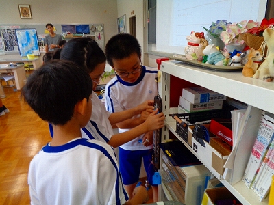 理科は、前回、電気を通す金属と通さないものを学習したので、今日は前回の学習を生かして豆電球がつく場所を理科室で探しました。