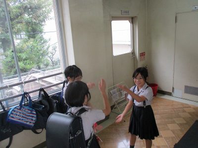 音楽の時間に「十五夜さんのもちつき」の歌に合わせて「手合わせ」をしています。