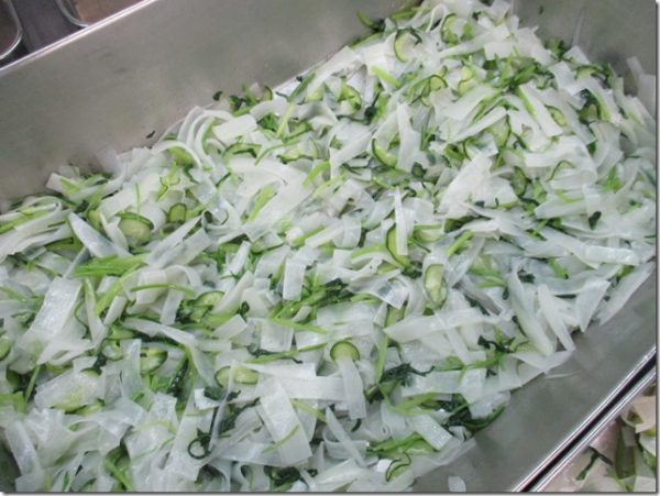 ☆大根、壬生菜、きゅうりのサラダです。レモン風味のドレッシングは酸味が効いていて、今日のような暑い日はさっぱり食べられます。壬生菜はゆでても、シャキシャキとした食感がおいしい野菜です。