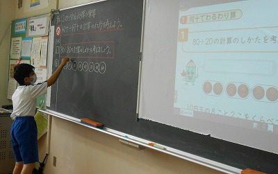 3時間目の算数は、新しい単元「2けたでわるわり算」について学習します。今日は、80円で20円のあめがいくつ変えるのかという問題に挑戦です。