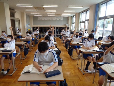礼拝の朝は、静寂の朝。登校した6年生は、自分の座席で静かに自学を進めます。