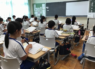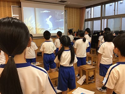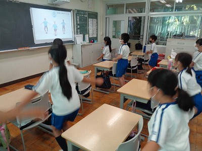3年生の体育は、初めてのラジオ体操です。いつもの準備体操の代わりに、取り組みました。