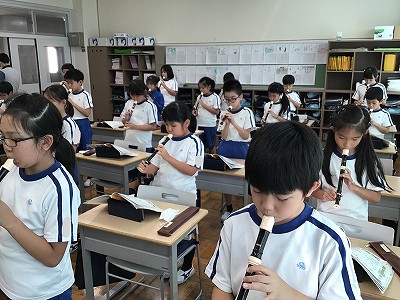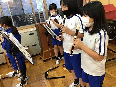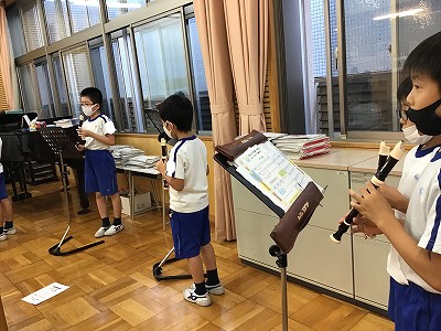 音楽室で「♪帰り道」と「♪レッツゴーソーレ!」の楽譜読みと、リコーダーの指練習を行いました。