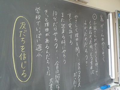1時間目は、月かげです。今日は「ゲームのやくそく」というお話を読みます。このお話は、ゲームのやくそくを破ってしまった友達に、本当の理由を聞かずに、ひどい言い方をしてしまう女の子のお話でした。