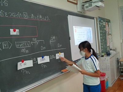 今日の算数は「割合」の学習です。つなげた図やまとめたテープ図をつかって、複数の割合から答えを出す問題を解いていきます。2倍の3倍は6倍というように、割合をまとめて計算することができる事を学びました。