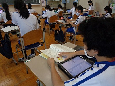 国語の時間。今日は、新しいお話「たずねびと」に入りました。先生が本文を読み、初めて読んだ感想をロイロノートに書きました。