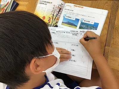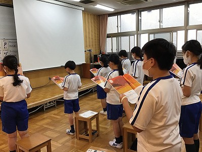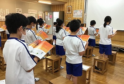 5年生の歌声が優しく響く「♪赤とんぼ」の歌唱から学習を始めました。CDの伴奏でも、ピアノに合わせても、息継ぎや速度に注意して歌おうという、心構えが感じられます。
