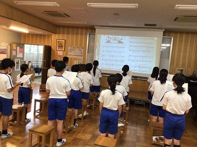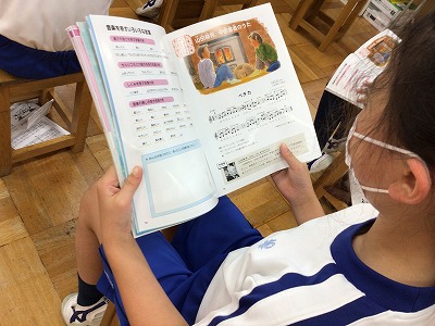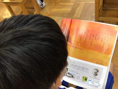 もう一つの学習は「にっぽんの歌」コーナーから、「♪赤とんぼ」と「♪ペチカ」の2曲と出会う時間です。「♪赤とんぼ」の作詞者・三木露風の紹介文を読んだり、作曲者・山田耕筰の功績を知る学習を行いました。