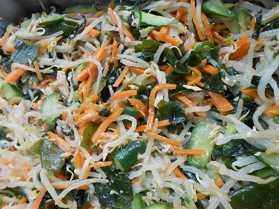 わかめ、もやし、きゅうり、人参のサラダはさっぱりした美味しさで、もやしのシャキシャキとした食感が良いアクセントでした。