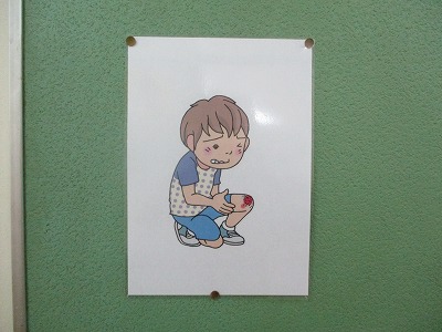 怪我をしているイラストにフィルムを重ねると、正しい手当が分かる掲示になっています。