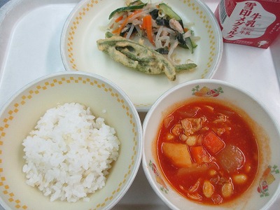 トマトピューレやケチャップで味つけし、酸味が強くならないように気をつけています。植物性のたんぱく質が豊富な大豆も混ぜて煮込みました。
