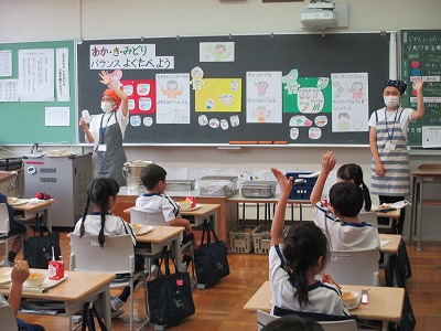 1年生の教室では「あか・き・みどり バランスよく食べよう」というタイトルで、食べ物の役割によって食品が三色に分けられることや、三色に分けられる食べ物をバランスよくとることで、毎日健康に過ごすことが出来るというお話でした。