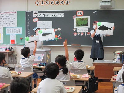 2年生の教室では「旬のたべものについて知って食べよう」というタイトルで、秋に旬を迎えるさつまいも、秋刀魚、きのこ、くり、れんこんの紹介がありました。旬の食べ物はストレスを受けることなく、すくすくと成長することで栄養をたっぷり含んでいて、季節を運んできてくれるという旬の良さを伝えてくれました。