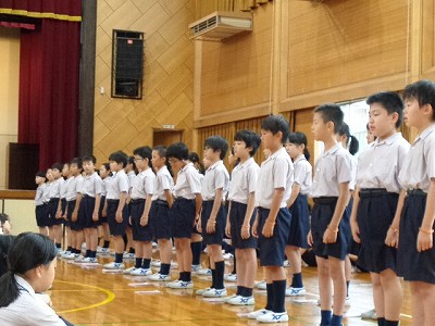 毎朝の「朝ねっこタイム」や宿題で音読練習を重ね、すっかり暗唱できていても、全校生の前での発表は、やはり緊張します。それでも、発表後に1年生から「声がそろっていてよかったです。」と言ってもらえました。声をそろえるというのは「心を合わせる」ということだ、と意識しながら練習してきた成果が出た!と感じて嬉しくなりました。