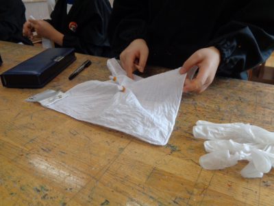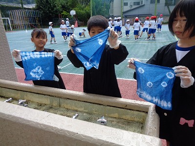 布をしぼる場所によって、模様が人それぞれで、すてきな仕上がりに、みんなうれしそうな表情でした。