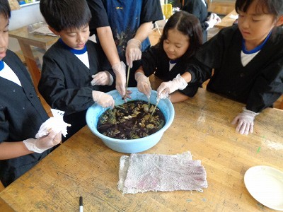 できたら、藍の染め液の中にひたします。独特なにおいをかぎながら、どんな色になるんだろうと楽しみにしながら待ちました。
