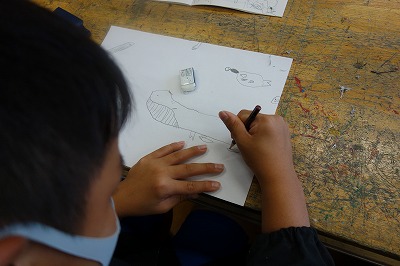 「想像したものや世界」と「好きなもの」と2つ提案して、どちらかから主題に迫る声かけをしました。「想像したものや世界」では「宇宙」や「海の中」「土の中」「雲をはさんで晴れている上と雷雨の下」など、おもしろい想像をして下絵を考えていました。