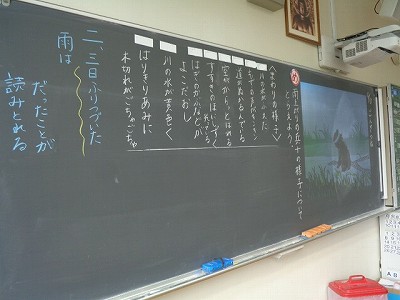 まずは、雨上がりの村の「情景」についての描写をみんなでとらえていきました。いろいろな表現で描かれた情景の端々から、どんな事が読み取れるかを考えていきました。