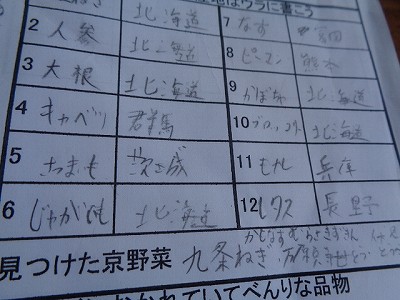 京野菜も、いくつか見つけることができました。かもなすや万願寺甘とう、九条ネギ、伏見とうがらし、紫ずきんなどで、予想外の数の多さに、プリントに書ききれないほどでした。