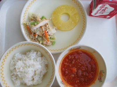 チリコンカーンは、アメリカ合衆国のテキサス州発祥といわれています。給食では材料に入れていませんが、アメリカでは、トウガラシを入れて作られるそうです。チリコンカーンはほかにも、ひき肉を使うということも特徴的です。