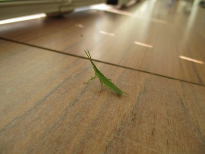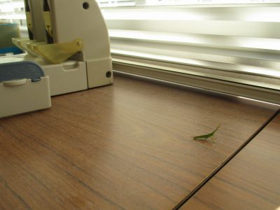 職員室の片隅を見ると、なぜかバッタが窓際を散歩!